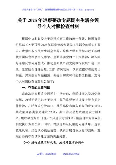 / 关于2025年巡察整改专题民主生活会领导个人对照检查材料