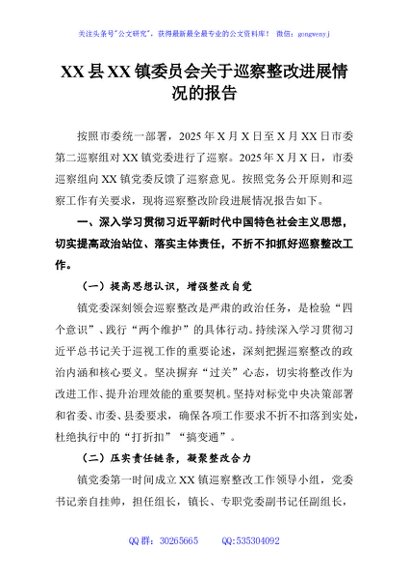 / XX县XX镇委员会关于巡察整改进展情况的报告