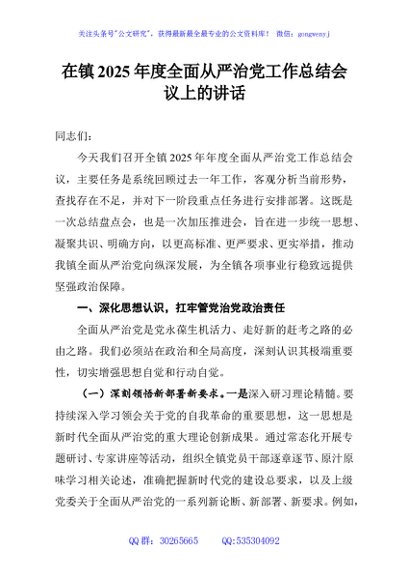 / 在镇2025年度全面从严治党工作总结会议上的讲话