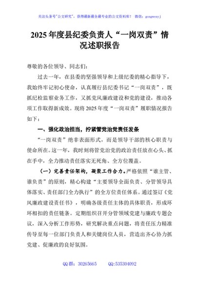 / 2025年度县纪委负责人“一岗双责”情况述职报告