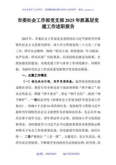 / 市委社会工作部党支部2025年抓基层党建工作述职报告