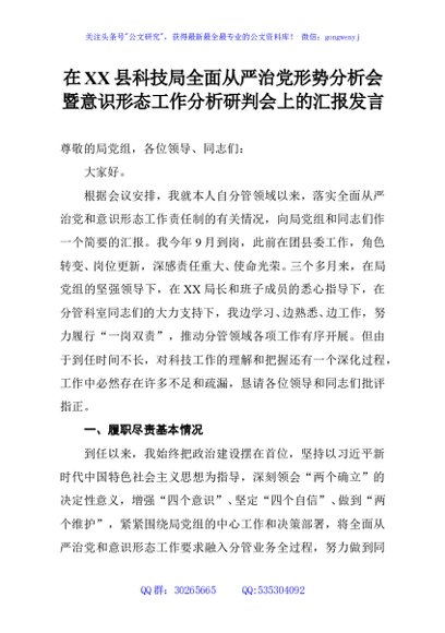 / 在XX县科技局全面从严治党形势分析会暨意识形态工作分析研判会上的汇报发言