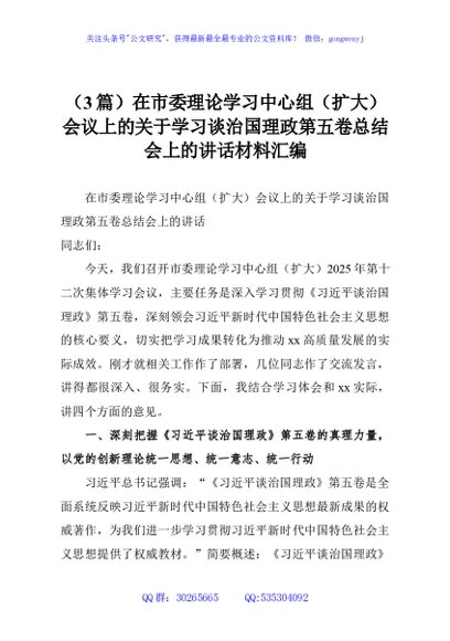(3篇)在市委理论学习中心组(扩大)会议上的关于学习谈治国理政第五卷总结会上的讲话材料汇编