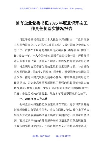 / 国有企业党委书记2025年度意识形态工作责任制落实情况报告