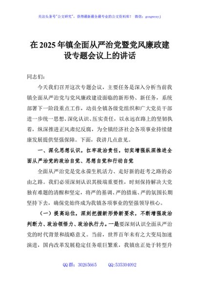 / 在2025年镇全面从严治党暨党风廉政建设专题会议上的讲话