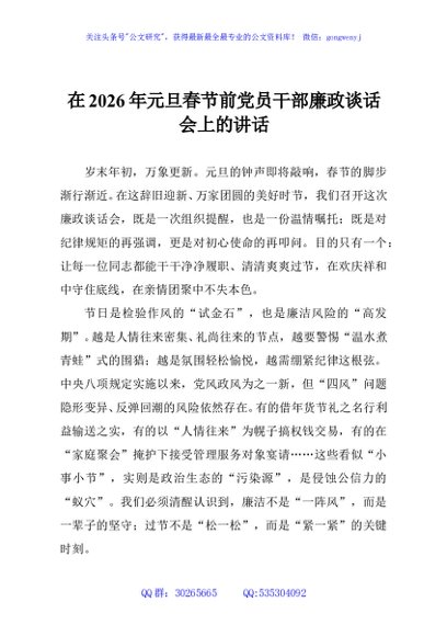 / 在2026年元旦春节前党员干部廉政谈话会上的讲话