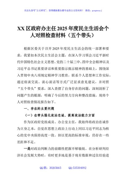 / XX区政府办主任2025年度民主生活会个人对照检查材料(五个带头)