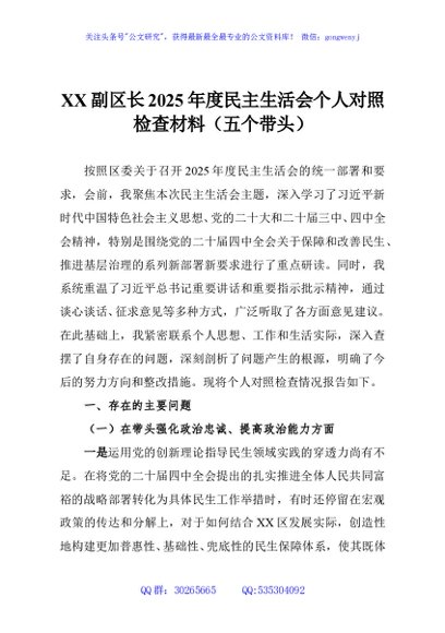 / XX副区长2025年度民主生活会个人对照检查材料(五个带头)
