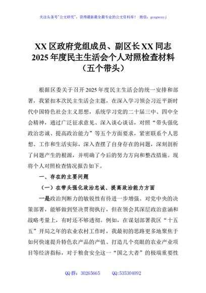 / XX区政府党组成员、副区长XX同志2025年度民主生活会个人对照检查材料(五个带头)