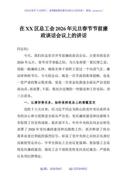 / 在XX区总工会2026年元旦春节节前廉政谈话会议上的讲话