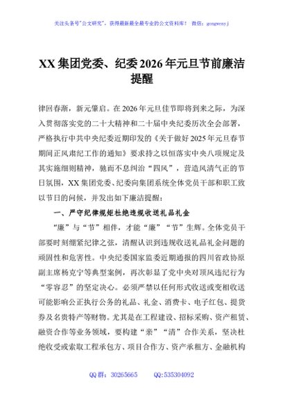 / XX集团党委、纪委2026年元旦节前廉洁提醒