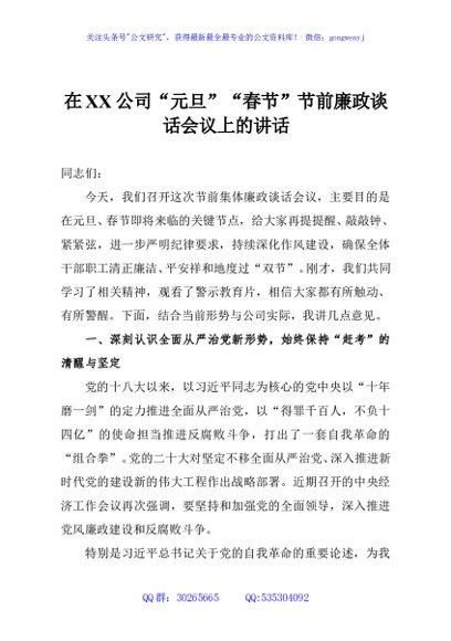 / 在XX公司“元旦”“春节”节前廉政谈话会议上的讲话
