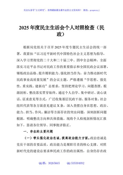/ 2025年度民主生活会个人对照检查(民政)