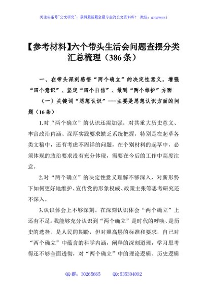 / 【参考材料】六个带头生活会问题查摆分类汇总梳理(386条)