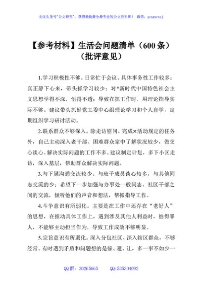 / 【参考材料】生活会问题清单(600条)(批评意见)