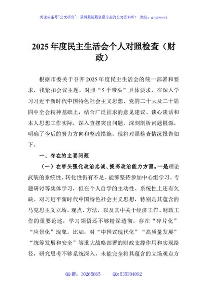 / 2025年度民主生活会个人对照检查(财政)