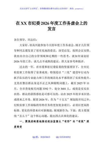 / 在XX市纪委2026年度工作务虚会上的发言