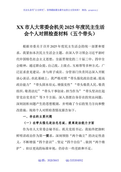 / XX市人大常委会机关2025年度民主生活会个人对照检查材料(五个带头)