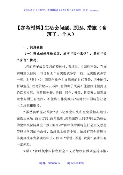 【参考材料】生活会问题、原因、措施(含班子、个人)