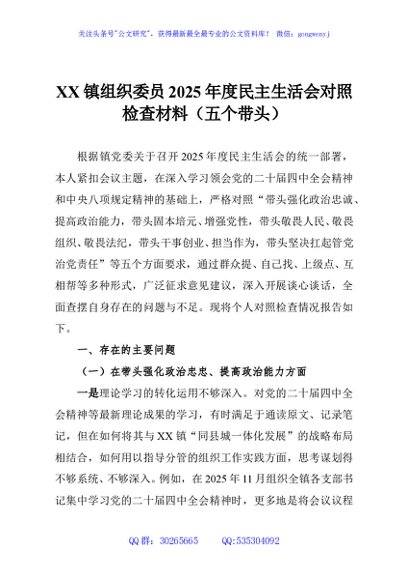 / XX镇组织委员2025年度民主生活会对照检查材料(五个带头)