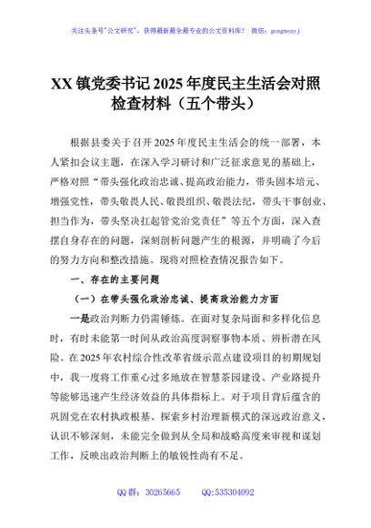 / XX镇党委书记2025年度民主生活会对照检查材料(五个带头)