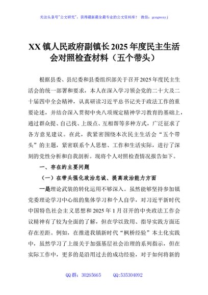 / XX镇人民政府副镇长2025年度民主生活会对照检查材料(五个带头)