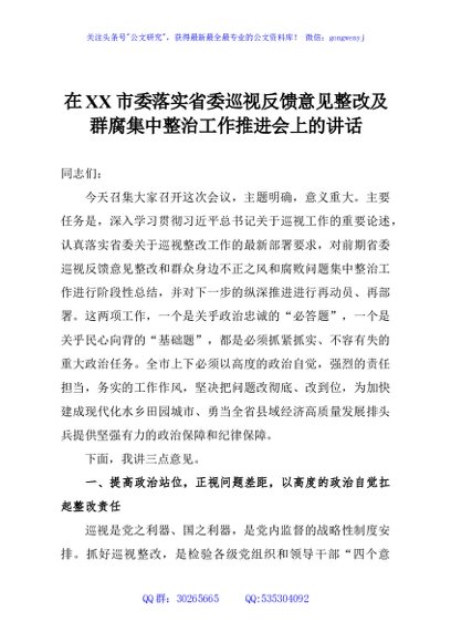 / 在XX市委落实省委巡视反馈意见整改及群腐集中整治工作推进会上的讲话
