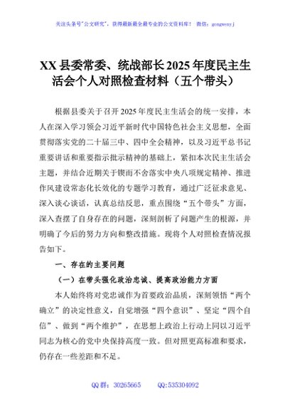 / XX县委常委、统战部长2025年度民主生活会个人对照检查材料(五个带头)