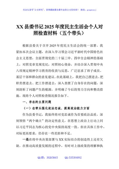 / XX县委书记2025年度民主生活会个人对照检查材料(五个带头)