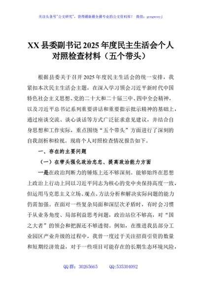 / XX县委副书记2025年度民主生活会个人对照检查材料(五个带头)