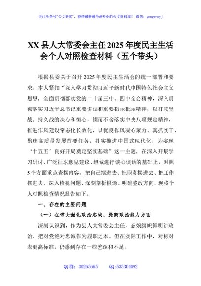 / XX县人大常委会主任2025年度民主生活会个人对照检查材料(五个带头)