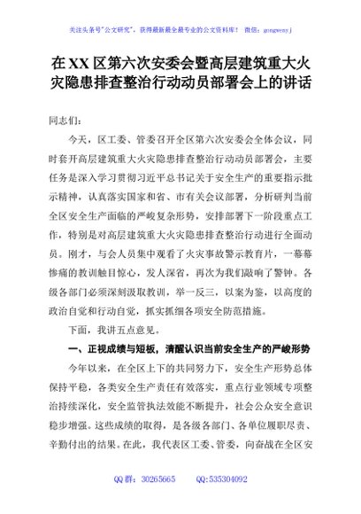 / 在XX区第六次安委会暨高层建筑重大火灾隐患排查整治行动动员部署会上的讲话