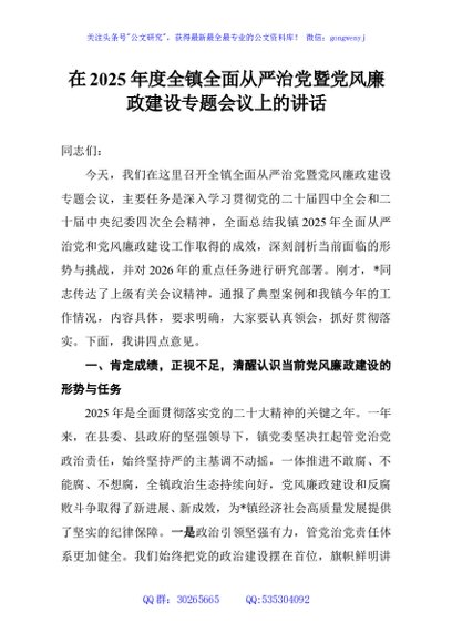 / 在2025年度全镇全面从严治党暨党风廉政建设专题会议上的讲话