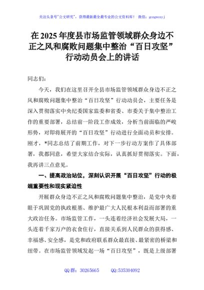 / 在2025年度县市场监管领域群众身边不正之风和腐败问题集中整治“百日攻坚”行动动员会上的讲话