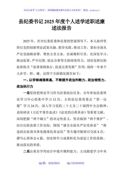 / 县纪委书记2025年度个人述学述职述廉述法报告