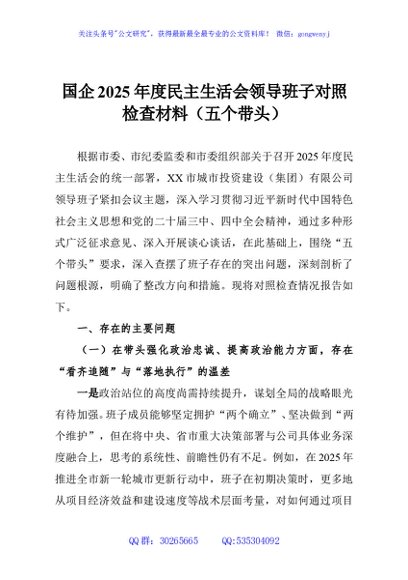 / 国企2025年度民主生活会领导班子对照检查材料(五个带头)
