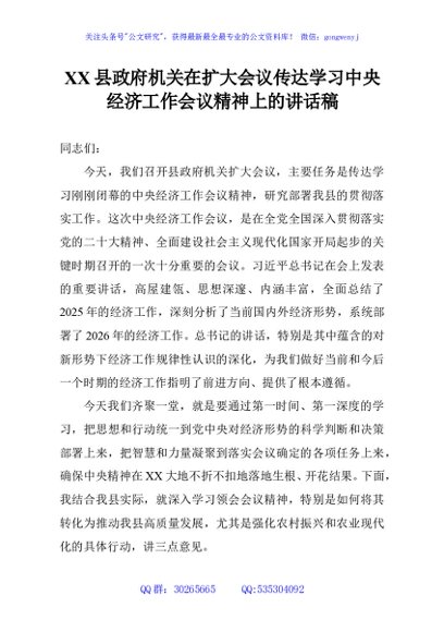 / XX县政府机关在扩大会议传达学习中央经济工作会议精神上的讲话稿