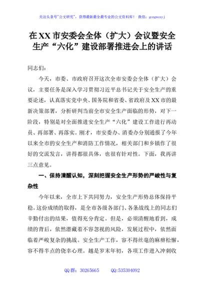 / 在XX市安委会全体(扩大)会议暨安全生产“六化”建设部署推进会上的讲话