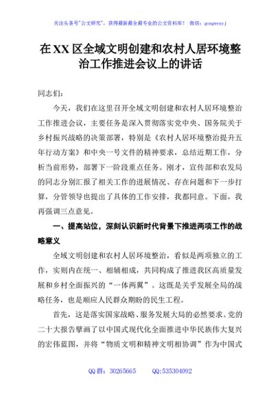 / 在XX区全域文明创建和农村人居环境整治工作推进会议上的讲话
