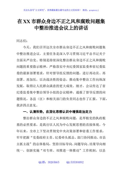 / 在XX市群众身边不正之风和腐败问题集中整治推进会议上的讲话