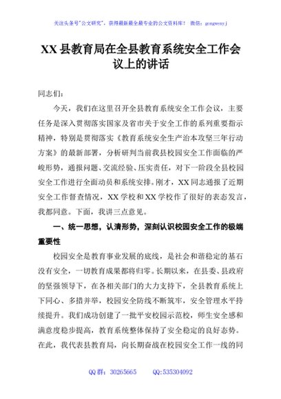 / XX县教育局在全县教育系统安全工作会议上的讲话