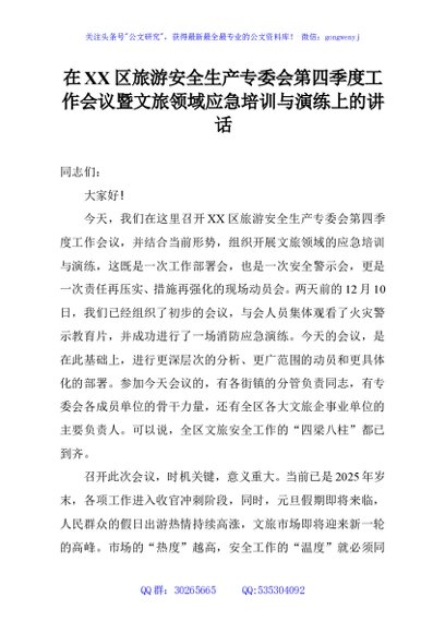 / 在XX区旅游安全生产专委会第四季度工作会议暨文旅领域应急培训与演练上的讲话
