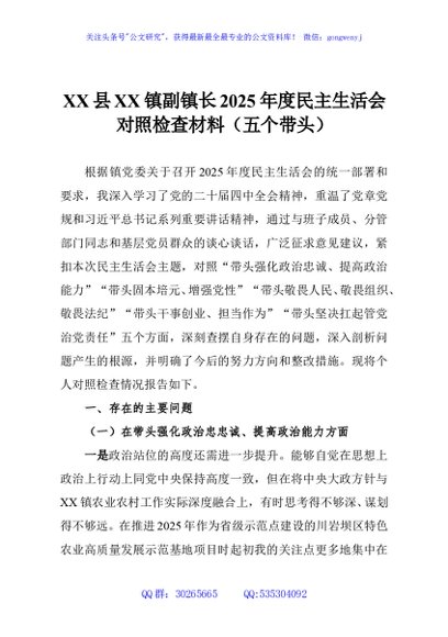 / XX县XX镇副镇长2025年度民主生活会对照检查材料(五个带头)