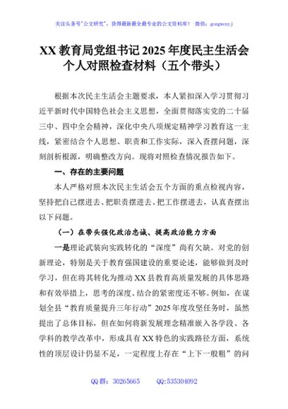 / XX教育局党组书记2025年度民主生活会个人对照检查材料(五个带头)
