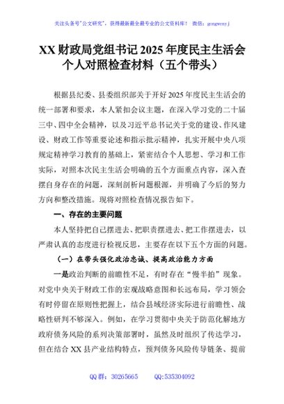 / XX财政局党组书记2025年度民主生活会个人对照检查材料(五个带头)