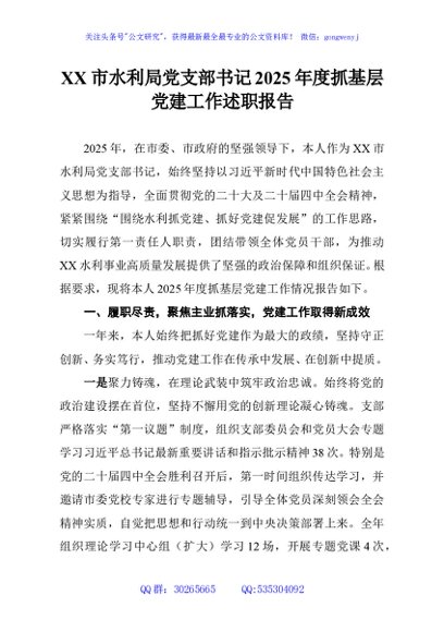 / XX市水利局党支部书记2025年度抓基层党建工作述职报告