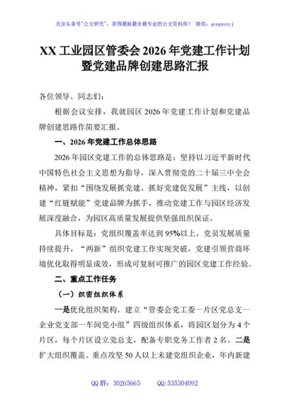 / XX工业园区管委会2026年党建工作计划暨党建品牌创建思路汇报