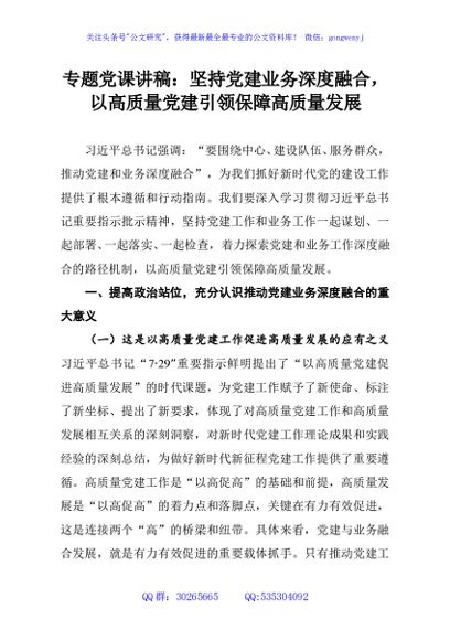 / 专题党课讲稿:坚持党建业务深度融合,以高质量党建引领保障高质量发展