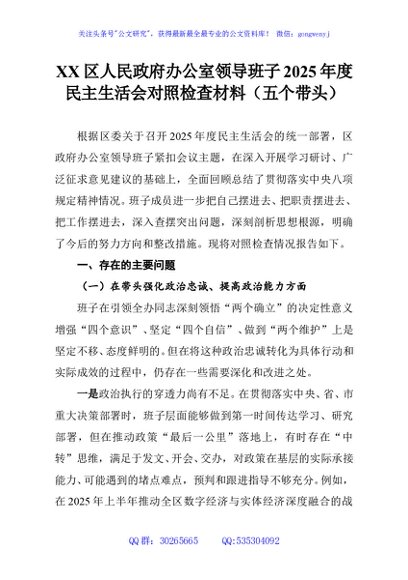 / XX区人民政府办公室领导班子2025年度民主生活会对照检查材料(五个带头)