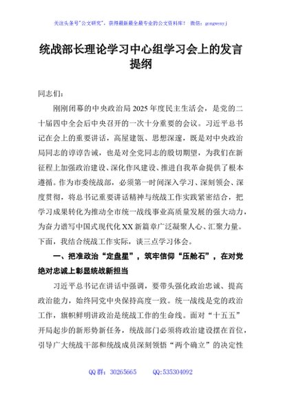 / 统战部长理论学习中心组学习会上的发言提纲